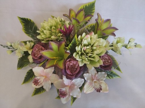 Kompozycja sztuczna (tzw. stroik, ikebana) jest wykonana z sztucznej choiny w doniczce plastikowej podłużnej tzw. łódce co daje jej stabilność.