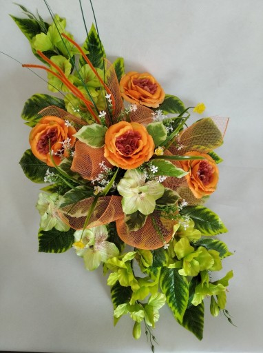 Wykonany na uniwersalnym flakonie plastikowym zabetonowanym z choiną sztuczną, gotowy tylko do włożenie do wazonu! Flakon ma średnice 12 cm od góry i 7 cm od dołu, ma 10 cm wysokości. Kompozycja do wazonu ma ok. 60 cm wysokości i 45 cm szerokości.