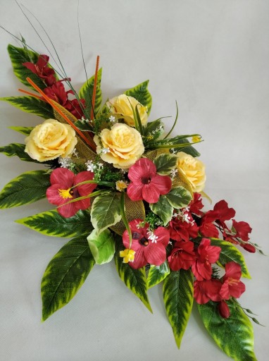 Kompozycja sztuczna (tzw. stroik, ikebana) jest wykonana z sztucznej choiny w doniczce plastikowej co daje jej stabilność.
