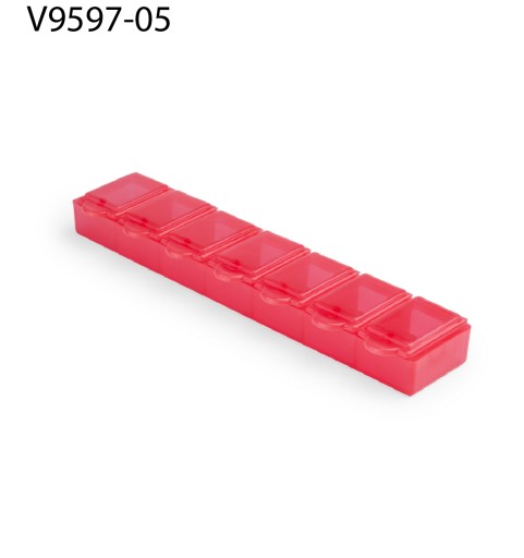 Półprzezroczysty pojemnik na tabletki z 7 przegrodami.