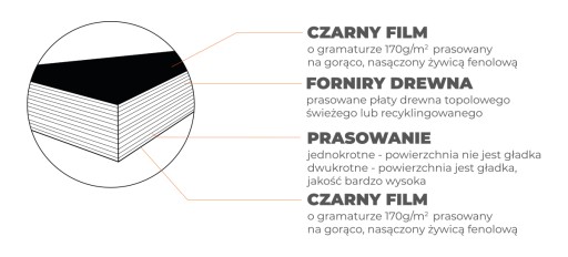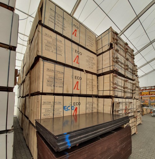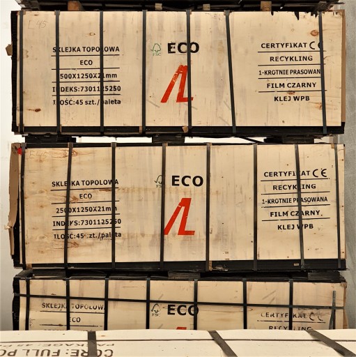 Sklejka topolowa ECO posiada pierwsze 3 forniry nowe, natomiast rdzeń stanowią forniry pochodzące z recyklingu. W zależności od zastosowania produkt wystarczy na 1-2 użycia. Powierzchnia sklejki pokryta jest wodoodpornym filmem fenolowym, a brzegi dodatkowo zostały zabezpieczone farbą akrylową. Zapobiega to przenikaniu wilgoci.