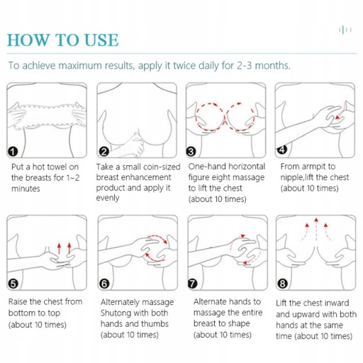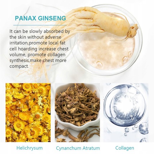 "Opis produktu:Jest to wyjątkowy krem, który wchłania się bardzo szybko. Przenikając głęboko w piersi daje szybkie rezultaty, ponieważ stosuje się bezpośrednio do tkanek docelowych. Wynik końcowy jest widoczny w ten sposób, że ujędrnia i wzmacnia piersi. Krem pomaga pomóc na obwisłe piersi poprzez wzmocnienie i podniesienie tkanek. Krem przyspiesza aktywację komórek całej piersi, podnosi piersi w krótkim okresie. Ponadto, składniki kremu mogą skutecznie zniwelować rozluźnienie tkanek, pomagają wzmocnić i podnieść biust w krótkim czasie, i wtedy Twoja linia ciała jest jeszcze bardziej atrakcyjna :)Uwaga: Data ważności wynosi 3 lata od daty produkcji (data produkcji podana na produkcie).Główne składniki: Wyciąg z Kigeline, zielonej papai i Pueraria Mirifica.Prawidłowe techniki masażu:Krok 1: krem masujesz dookoła piersi, w ten sposób, aby unikać kontaktu z sutkiem.Krok 2: lekko się schylić, położyć obie ręce na piersi i popychać w górę 10 razy.Krok 3: od pachy do środka popychać 10 razy.Porady stosowania:W pierwszym tygodniu stosowania, należy stosować masaż dwa razy dziennie - rano i wieczorem.Krem jest bardziej efektywny w użyciu po kąpieli.Gdy biust staje się pełniejszy, pamiętaj, aby nosić biustonosze odpowiednio dobrane :)Uwaga: Nie nadaje się dla kobiet w ciąży."
