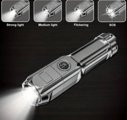 Latarka posiada 4 TRYBY pracy, zmienia się je poprzez przyciśnięcie przycisku znajdującego się na korpusie latarki. W celu uruchomienia trybu "SOS", należy przytrzymać przycisk przez 2-3 sekundy.