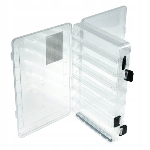 Zaprojektowane pudełko jest dwustronne, by w precyzyjny sposób pomieścić nawet 14 dużych przynęt a specjalne wyprofilowane rynienki zapobiegają plątaniu się kotwic.