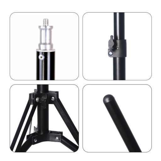 ✅ Główna kolumna składa się z czterech sekcji, blokowanych za pomocą śrub typu motylek. Dzięki teleskopowej regulacji możliwa jest praca na dowolnie wybranej wysokości od 50 do 185 cm. Wysokość 185 cm jest osiągalna w klasycznym układzie, kiedy nóżki są maksymalnie wysunięte. Kiedy biegną one równolegle do podłogi, maksymalna wysokość statywu wynosi 145 cm. Statyw został wyposażony w głowicę 16 mm zakończoną standardowym gwintem fotograficznym 1/4 cala, dzięki czemu można zamontować na nim rozmaite akcesoria fotograficzne czy oświetlenie – lampy studyjne, lampy LED czy niewielkie softboxy światła stałego.