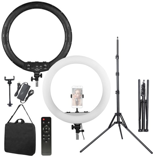 ✅ Bardzo duża lampa pierścieniowa LED o średnicy aż 53 cm, oferująca płynną regulację mocy, a także temperatury barwowej w szerokim zakresie od 3000 do 6000 K. Porty USB w obudowie pozwalają na ładowanie smartfonów w trakcie długiej pracy. W komplecie uchwyt do telefonu na giętkim ramieniu oraz pilot do zdalnego sterowania światłem.
