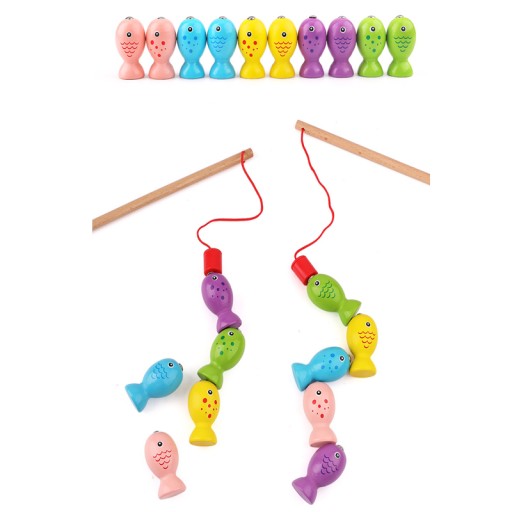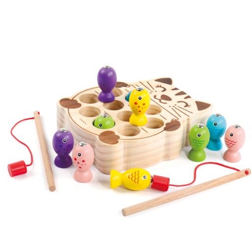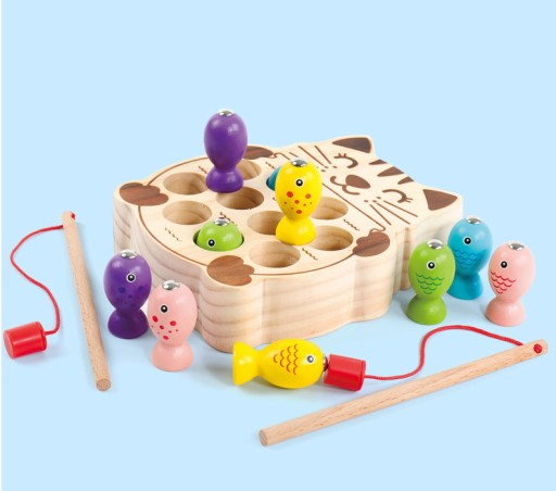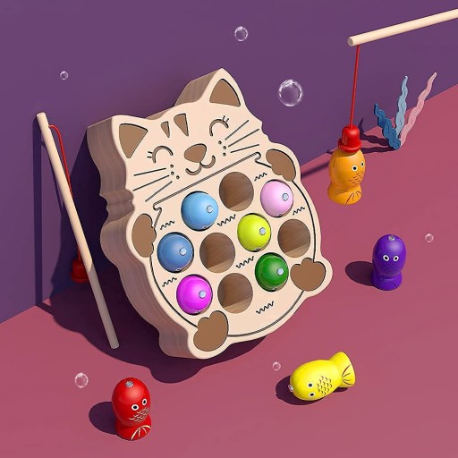 Zestaw zawiera kolorowe rybki z magnesami które unosimy z pomocą wędki a następnie umieszczamy w otworach podstawy kotka. Dziecko może dowolnie przenosić i sortować rybki. Taka zabawa szybko się nie znudzi! :)