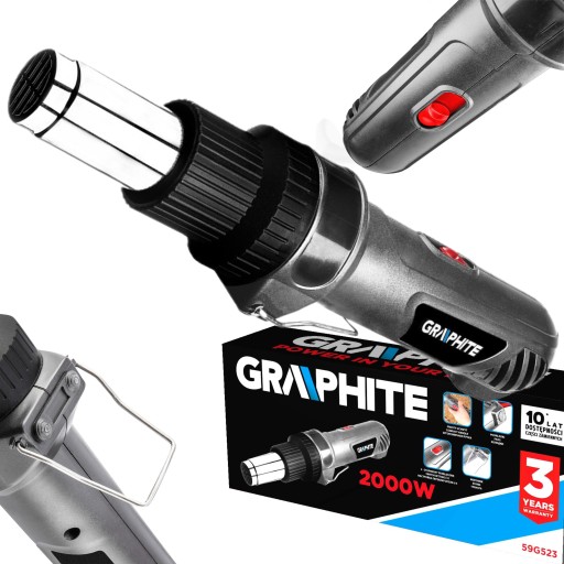 Opalarka marki GRAPHITE posiada konstrukcję umożliwiającą korzystanie z niej w trudno dostępnych miejscach. Lekka waga przyczynia się do długotrwałej pracy, bez obawy o zmęczenie. Opalarka wyposażona została w 3 metrowy kabel zasilający. Narzędzie ma prosty uchwyt, praktyczny wspornik oraz przydatne podkładki.