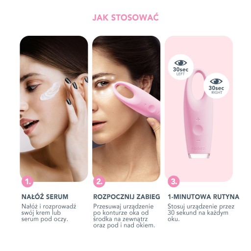 Masażer pod oczy IRIS szwedzkiej firmy FOREO sprawi, że problem cieni i worków pod oczami zniknie na zawsze. Urządzenie jest oparte na unikalnej technologii pulsacji T-Sonic, dzięki której skutecznie pozbędziesz się widocznych oznak starzenia i zmęczenia. Technologia T-Sonic przynosi delikatnej skórze wokół oczu kojący, limfatyczny masaż, który redukuje widoczne zmarszczki, kurze łapki, cienie oraz worki pod oczami.