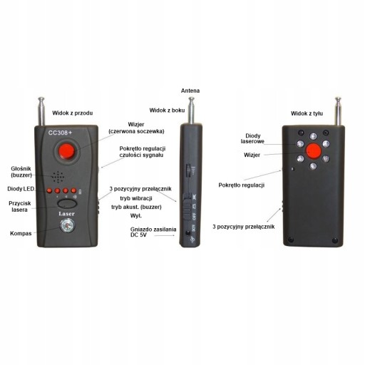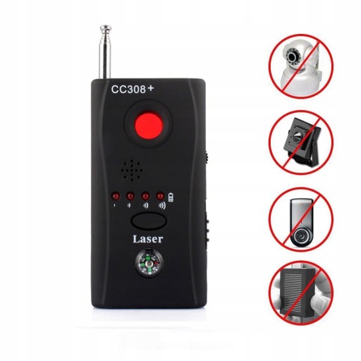 Detektor podsłuchów pozwala zlokalizować urządzenia szpiegujące (pluskwy), podsłuchy GSM, lokalizatory, kamery i inne urządzenia szpiegujące. Za pomocą specjalnego obiektywu i światła diod można odnaleźć ukryte obiektywy kamer.