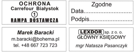 UWAGA! Treść pieczątek jest kopiowana z wiadomości do sprzedającego. Prosimy w związku z tym o dokładne sprawdzenie poprawności wysłanej treści. Po zrealizowaniu zamówienia, bądź wcześniejszej akceptacji projektu nie ponosimy odpowiedzialności za błędy w przesłanej treści.