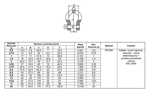 Szekla stalowa kuta, okrągła (omega) ze sworzniem wkręcanym z uchem i kołnierzem – typ W,przeznaczona jest podnoszenia ładunków (przedmiotów, materiałów i towarów), także do zawiesi linowych stalowych oraz zawiesi włókiennych.