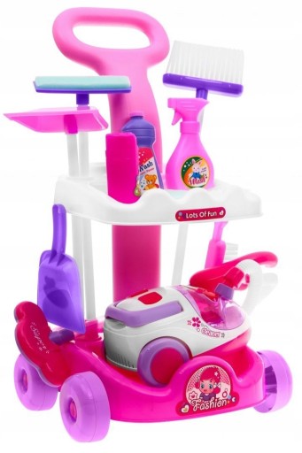 Profesjonalnie wyposażony zestaw sprzątający na wózku z odkurzaczem i kompletem akcesoriów do mycia oraz sprzątania pozwoli wczuć się każdej małej dziewczynce w rolę Perfekcyjnej Pani Domu. Dzieci, a zwłaszcza małe dziewczynki uwielbiają naśladować swoje mamy sprzątaniu, gotowaniu i pozostałych pracach domowych.