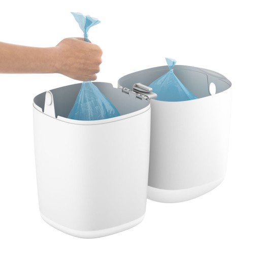 Konstrukcja pojemnika umożliwia wygodną jednoręczną obsługę i higieniczne opróżnianie. Zabezpieczony nożyk wewnątrz pojemnika ułatwia odcinanie worka.
