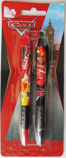Zestaw szkolny zawiera długopis i ołówek automatyczny w oprawkach w kolorze czerwonym i czarnym, z nadrukami przedstawiającymi bohaterów filmów z serii Cars / Auta. Produkt marki Derform na licencji Disney Pixar. Na opakowaniu jest ślad po zerwanej cenie.