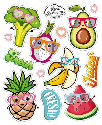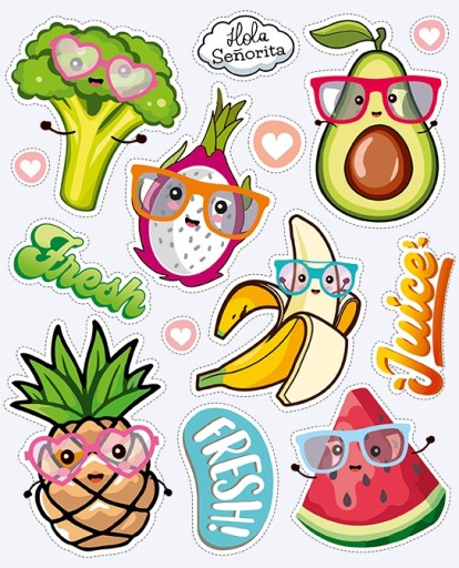 Wesołe owocki to nie tylko ciekawe urozmaicenie odzieży. To także zachęta by odżywiać się zdrowiej, co w gruncie rzeczy prowadzi do lepszego samopoczucia i funkcjonowania. Arkusz oprócz śmiesznych owoców w okularach przedstawia także pana Brokuła, który zdecydowanie należy do grona tych zdrowszych a także napisy "Fresh" czy "Juice". Wy z kolei możecie "reFreshować" waszą odzież, naprasowując te śmieszne Naplamki w miejscach, które chcielibyście zakryć.