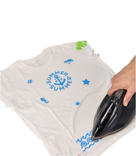 Naklejki Wesołe owocki to produkt wykonany w technologii DTF. Naklejki składają się z dwóch cienkich warstw, są cieńsze od naklejek typu Folia Flex jednak równie trwałe i rozciągliwe. To co wyróżnia te naklejki to wielokolorowość oraz kształty i wzory niemożliwe do uzyskania w technologi Flex, np. spiralne napisy, drobne wąskie paseczki itp. Z kolei naklejki te nie posiadają zdobień typu brokat czy odbicie, ale też ich cena jest odpowiednio niższa niż w przypadku naprasowanek Flex.