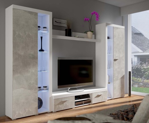 Zestaw meblowy Rumba ma wszystko to co powinna mieć nowoczesna meblościanka. Centrum zestawu meblowego do salonu znajduje się szafka RTV o szerokości 150 cm. To wystarczająco, by zmieścić duży telewizor do salonu. Posiada ona dwie otwarte półki, gdzie z powodzeniem zmieści się dekoder satelitarny, odtwarzacz blu-ray czy tez konsola do gier. Obok ma swoje miejsce praktyczna i pojemna szafka mogąca przechować wiele płyt z filmami, muzyką czy też grami. Nad telewizorem zawiśnie półka naścienna o szerokości 140 cm. To dobre miejsce na ramkę ze zdjęciem, niewielki wazon lub książkę. Po obu stronach szafki RTV znajdują się przykuwające oko, wysokie witryny. Dwie mierzące 190 cm witryny posiadają w sumie aż 10 szklanych półeczek z możliwością ich podświetlenia! To idealne miejsce na cenne pamiątki, kryształy, a nawet biżuterię. Z pewnością pierwsze spojrzenie Twoich gości zwróci się ku zestawowi Rumba.