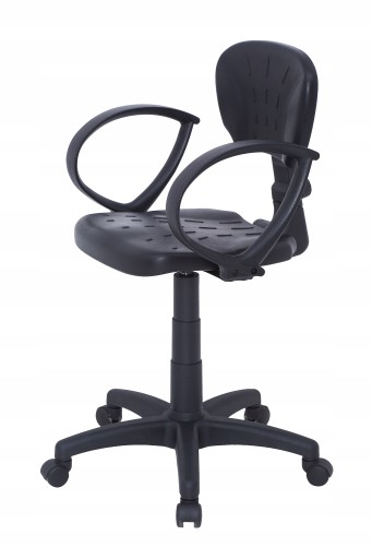 Antypoślizgowe siedzisko wykonane z miękkiego poliuretanu w czarnym kolorze (RAL 9005). Regulacja wysokości siedziska za pomocą mechanizmu CPT. Podłokietniki miękkie, wykonane z tworzywa sztucznego. Podstawa z czarnego poliamidu z włóknem szklanym o średnicy 60 cm, wyposażony w kółka do powierzchni miękkich. Istnieje możliwość wymiany kółek, szczegóły poniżej.