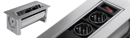 Stylowy mediaport do montażu w blacie, obrotowy. Posiada 2 gniazda elektryczne Schuko, przełącznik zasilania oraz podwójną ładowarkę USB. Długość kabla 1,5 m. W kolorze srebrnym.