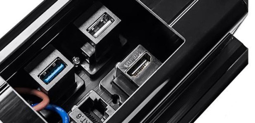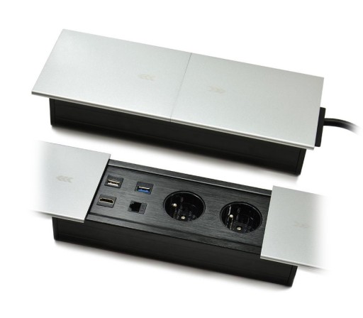 Mediaport Spacetronik ERGOLINE SPS-S26S to nowoczesne rozwiązanie, które znajduje zastosowanie w sklepach, salonach sprzedaży, salach konferencyjnych, biurach, a także w domu. Wykonany z aluminium i wysokiej jakości komponentów. Produkt jest przeznaczony do montażu wewnątrz pomieszczeń w biurkach, blatach i stołach, zarówno w pozycji pionowej jak i poziomej, zapewniając dostęp do gniazd. Oprócz standardowych gniazd zasilających posiada także porty USB 3.0, USB 2.0, HDMI oraz gniazdo Ethernet RJ-45, a wszystko to przykrywają dwie zasuwane alumioniowe pokrywy.