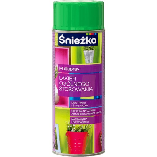 Śnieżka Multispray LAKIER OGÓLNEGO STOSOWANIA to wyrób wyprodukowany na bazie zmodyfikowanych i uszlachetnionych żywic syntetycznych charakteryzujący się idealnym kryciem, wysokim połyskiem i gwarantowaną powtarzalnością koloru. Może być stosowany na większość dostępnych podłoży z wyjątkiem niektórych plastików i styropianu.
