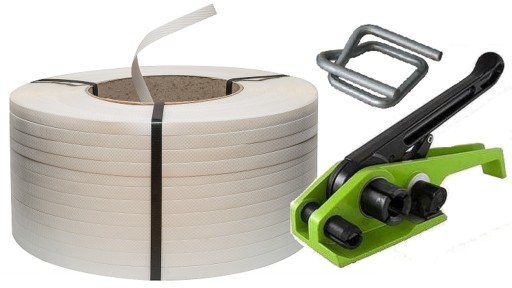 ZESTAW DO SPINANIA PALET/paczek do 500 kg. Wytrzymałość jest podana dla 5 spięć taśmą. Wytrzymałość można regulować ilością spięć. Taśma polipropylenowa jest spinana za pomocą zapinek drucianych i napinacza. Napinacz naciąga i odcina taśmę w wybranym miejscu.