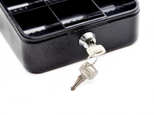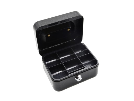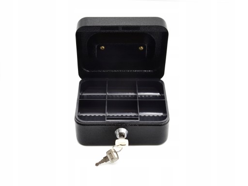 Metalowa kasetka na pieniądze. Zamykana na kluczyk (2 szt. w zestawie). Wyposażona w uchwyt do przenoszenia. W środku plastikowa wkładka z przegródkami: