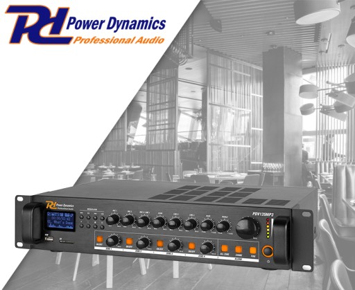 Power Dynamics PDV120MP3 to wzmacniacz 100 V z 4 strefami, które można oddzielnie włączać i wyłączać, ale można też osobno ustawić głośność. Ta opcja ułatwia skonfigurowanie wielostrefowego systemu nagłośnienia do dostarczania muzyki na przykład w branży gastronomicznej lub w miejscach publicznych. PDV120MP3 ma moc 120W do sterowania podłączonymi głośnikami. Wzmacniacz wyposażony jest również w Bluetooth, odtwarzacz MP3, radio i oczywiście wejścia liniowe dla mikrofonu i innych źródeł dźwięku. Z PDV120MP3 jako jednostką centralną, można połączyć wielostrefowy system nagłośnienia lub system nagłośnienia. Wzmacniacz jest wyposażony w „uszy”, dzięki czemu możliwy jest montaż w szafie 19”.
