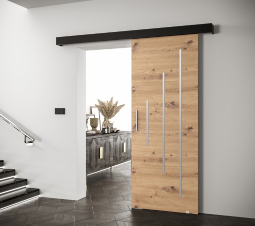 dąb artisan / maskownica: czarny mat / uchwyt i paski ozdobne: srebrny