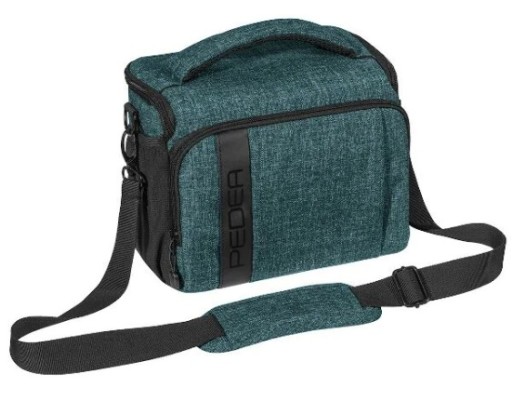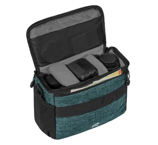 Modna torba na aparat fotograficzny do lustrzanek jednoobiektywowych z wodoodporną osłoną przeciwdeszczową, paskiem do przenoszenia i przegródkami na akcesoria.