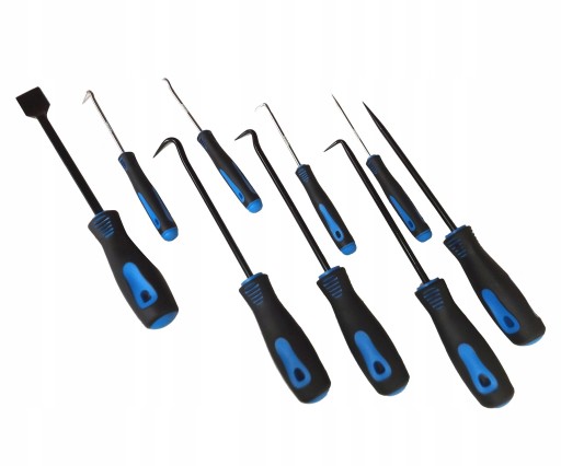 Zestaw grotów, haków i skrobaków 9el. Narzędzia przeznaczone do demontażu oringów,simeringów oraz wszelkiego rodzaju uszczelek. Doskonale sprawdzi się podczas oczyszczania elementów metalowych z różnego rodzaju uszczelniaczy. Rączki narzędzi wykonane zostały z wysokiej jakości antypoślizgowego tworzywa sztucznego zapewniającego pewny chwyt i komfort podczas pracy.