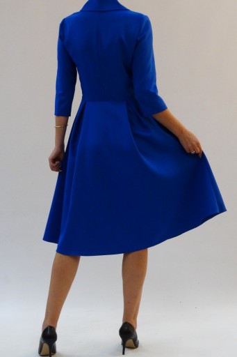 Dół sukienki rozkloszowany z pionowymi kontrafałdami które optycznie wyszczuplają sylwetkę.