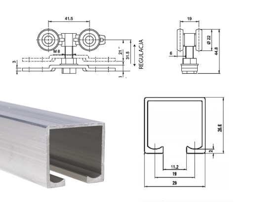 Pasuje do systemów wyposażonych w prowadnice oraz wózki o wymiarach identycznych z przedstawionymi na sąsiedniej grafice