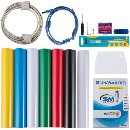Z dodatkowymi 6 rolkami karteczek samoprzylepnych (kolory: czarny, biały, czerwony, zielony, jasnożółty, niebieski), 1 rolką teksturowanego papieru (0,15 x 9 m / 5,9 x 354,3 cala), 1 nożem, 1 skrobakiem, 1 x Oprogramowanie SIGNMASTER, 1 x USB, 3 x ostrza, 3 x kable, itp. Kompaktowy rozmiar, można postawić na stole i łatwo przenosić.