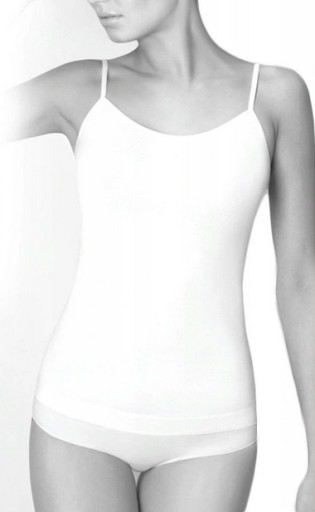 Koszulka damska z cienkimi ramiączkami. Wykonana z wysokogatunkowej delikatnej bawełny. Zastosowanie *bezszwowej techniki dziania i dodatek poliamidu gwarantuje jej elastyczność, dopasowanie i komfort noszenia.