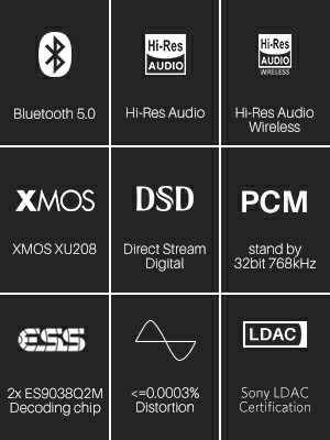 - DSD512 & PCM 32Bit/768Khz - XMOS XU208 zapewnia doskonałe możliwości dekodowania, USB obsługuje DSD64-DSD512 i PCM 16Bit/44.1KHz-32Bit/768kHz z czystszym dźwiękiem i lepszym rozszerzeniem wysokich częstotliwości.