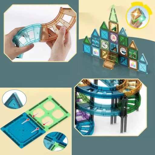 ➡️Zestaw charakteryzuje się łatwością łączenia poszczególnych elementów w dowolny sposób oraz pod różnymi kątami. Na bokach każdego klocka są wbudowane mocne magnesy neodymowe, którą z dużą siłą łączą ze sobą kolejne elementy tworząc przeróżne figury. Klocki można układać płasko tworząc tory, wężyki itp. oraz przestrzennie budując przeróżne figury trójwymiarowe. W ten sposób dzieci będą mogły pobudzać swoją wyobraźnię przestrzenną.