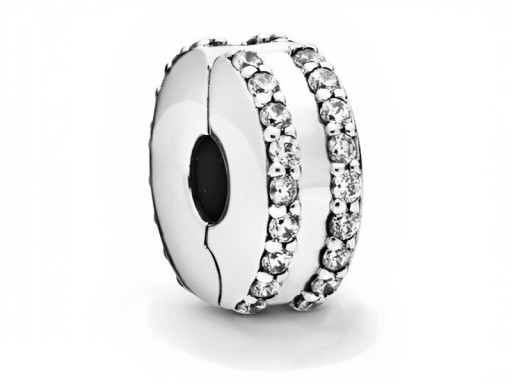 Elegancki wykonany z rodowanego srebra otwierany charms pasujący do bransolet modułowych o okrągłym kształcie, zdobiony na krawędziach białymi cyrkoniami.