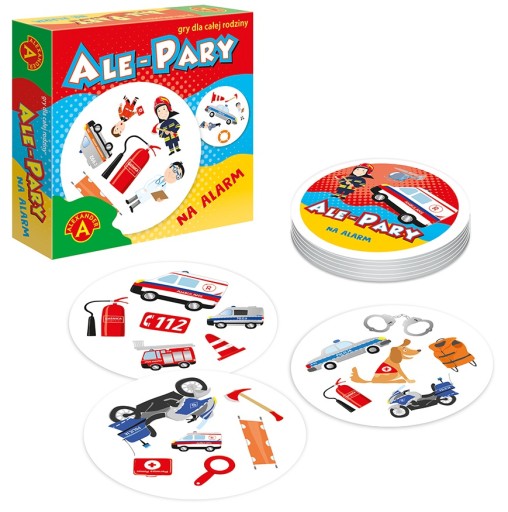 Ale Pary – Na Alarm to szybka, prosta gra karciana w której wygrywa ten kto wykaże się największą spostrzegawczością. W opakowaniu znajdziemy zestaw 31 kart z 6 obrazkami przedstawiające elementy związane z pracą służb publicznych czyli policji, pogotowia oraz straży pożarnej. Dwie dowolne karty zawsze mają po jednym wspólnym obrazku, ale żeby nie było zbyt łatwo, obrazki te często mają różną wielkość.