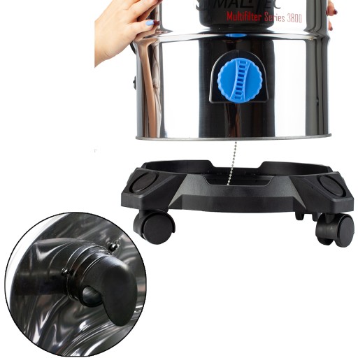 Największą część odkurzacza zajmuje zbiornik na nieczystości o pojemności aż 25 litrów wykonany z trwałej blachy nierdzewnej - dzięki czemu jest niezwykle odporny na uszkodzenia.