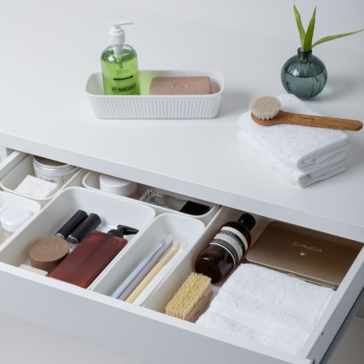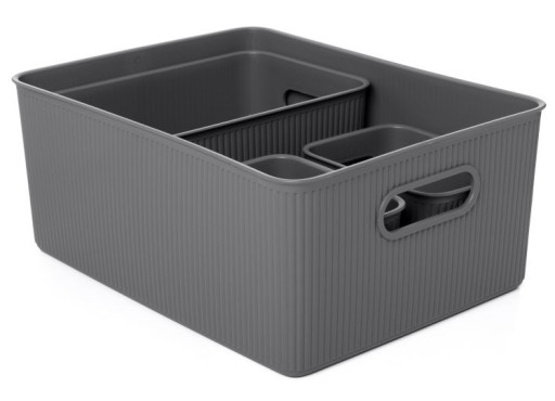 Dzięki pojemnikom, odseparujesz kosmetyki w łazience, przybory szkolne, czy domową apteczkę. Największy pojemnik może posłużyć jako wkład do szafy na bieliznę, skarpetki, a mniejszy jako organizer na biurko, czy blat.