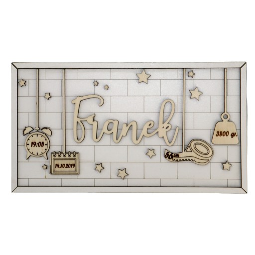 Personalizowana metryczka w kształcie prostokąta z modnym tłem do powieszenia na ścianie.