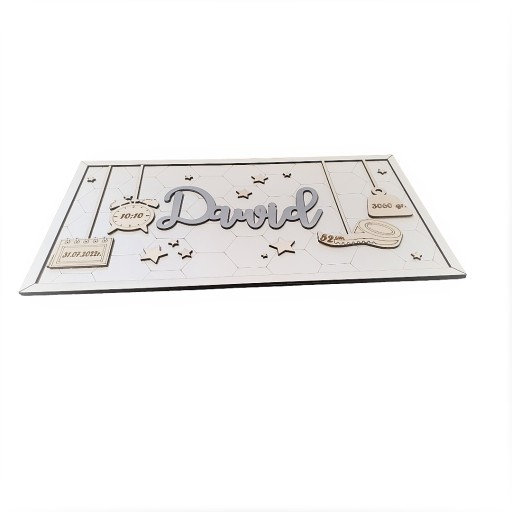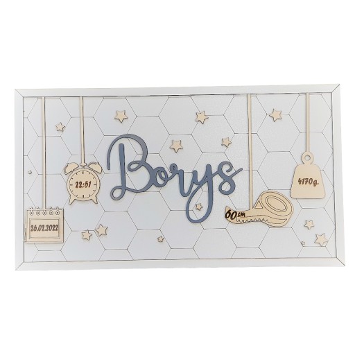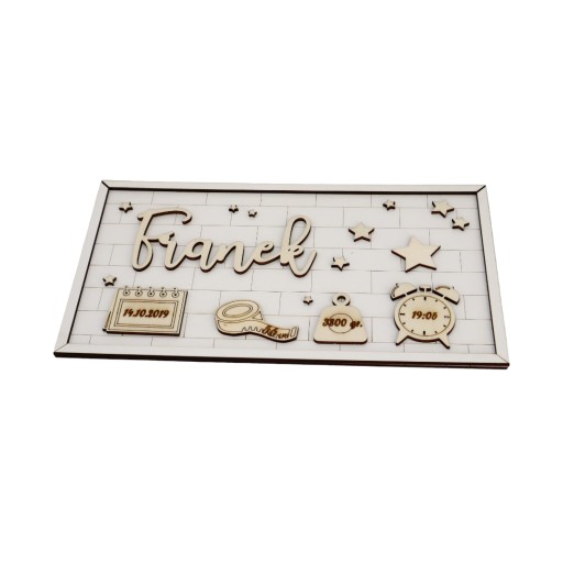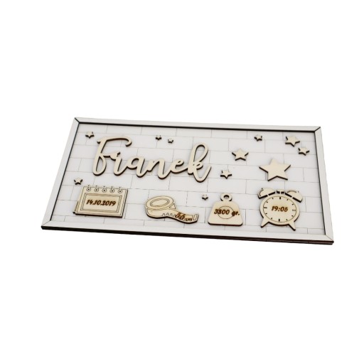 Personalizowana metryczka w kształcie prostokąta z modnym tłem do powieszenia na ścianie.