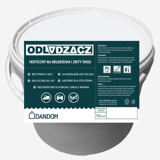 Działa skutecznie do -50 C. Szybko usuwa oblodzenia i zbity śnieg. Chłonąc wodę wydziela ciepło powodując rozpuszczanie lodu i osuszanie powierzchni.