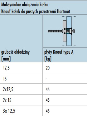 - Do 65 kg na kołek w przypadku mocowania do ściany szkieletowej na konstrukcji metalowej lub drewnianej.