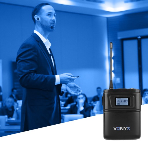 Vonyx WM61B to kompletny system mikrofonów bezprzewodowych z nadajnikiem bezprzewodowym (bodypack) oraz zestawem słuchawkowym i mikrofonem krawatowym. System pracuje na częstotliwości UHF i posiada 16 kanałów. Ze względu na tak dużą liczbę kanałów, łatwo jest przełączyć się na inną częstotliwość w mało prawdopodobnym przypadku zakłóceń. Dzięki temu WM61B gwarantuje transfer bez zakłóceń. Na szczęście interferencja z systemami mikrofonowymi pracującymi w wyższym paśmie częstotliwości UHF nigdy nie stanowi problemu. System jest dostarczany w komplecie z odbiornikiem, który można podłączyć do systemu dźwiękowego za pomocą dostarczonego kabla jack 6,3mm.