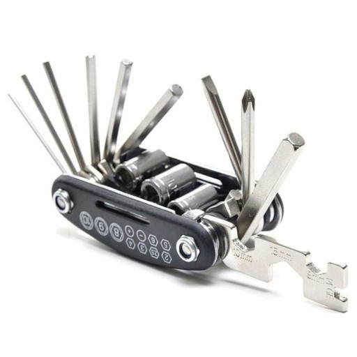 Komplet zawiera 16 narzędzi służących do konserwacji i drobnych napraw roweru. Całość została zamknięta w poręcznym i kompaktowym scyzoryku. Po złożeniu bez problemu mieści się w dłoni, jest łatwy w przechowywaniu i nie zajmuje dużo miejsca w rowerowej sakwie czy bagażniku. W zestawie znajdują się klucze imbusowe, wkrętaki, nasadki wraz z adapterem, a także klucze płaskie oraz specjalny klucz do szprych 14GE.