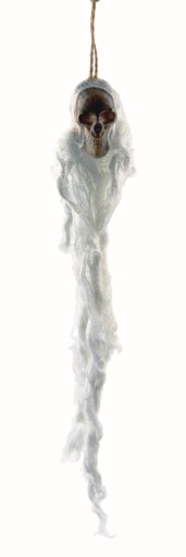 Gadżet na Halloween czaszka 5 cm z wiszącymi bandażami, długość dekoracji: 20-30 cm.