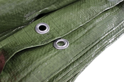 - Krawędzie plandeki zakończone są wzmacnianą podwójnie krawędzią z sznurkiem polipropylenowym. Na całym obwodzie plandeki co 100 cm są aluminiowe oczka o średnicy 12mm